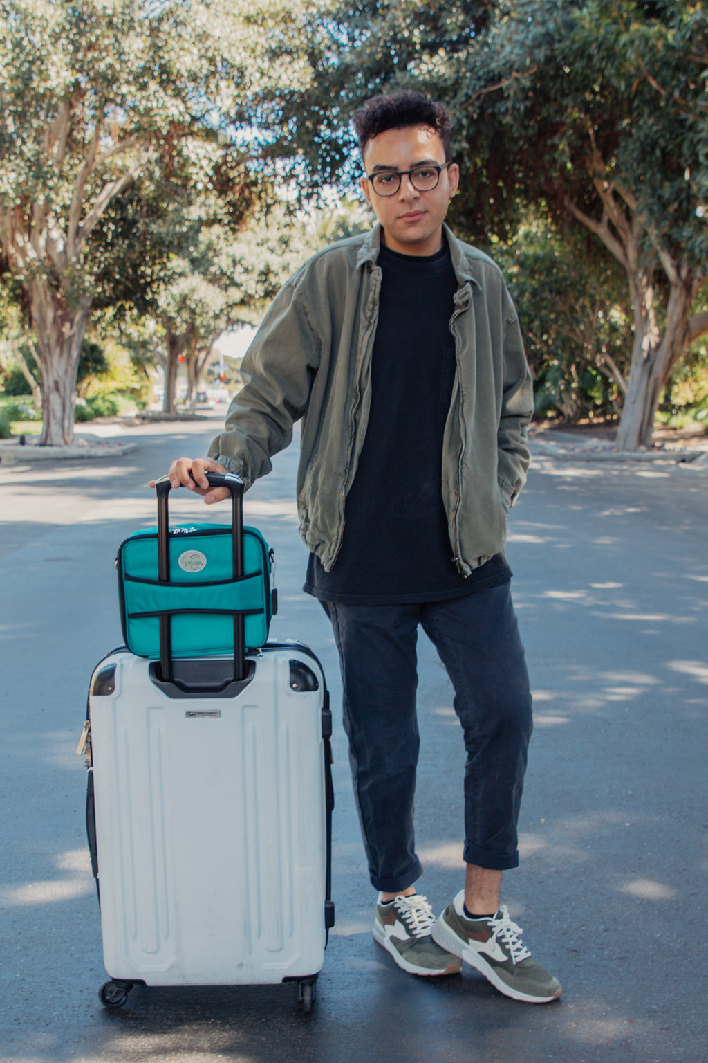 The Eugo comes with a detachable shoulder strap and a specialized luggage handle that slips over the handle of your rolling luggage.